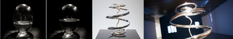 The phenomena of pressure, explosion, centrifugal motion and over-heating are all intimately linked with the processes of decay; conversely, suction, implosion, centripetal motion and cooling are the counterparts of growth and refinement. The outward or pressure-breath is therefore subordinate to the suction or in-breath. My understanding is that our over-dependence on technologies derived from decay processes hinders the development of consciousness. I am striving to create works which will help to redress this imbalance and thus open our human spirit to these subtle but immensely powerful impulses which are motive of self awareness, healing and refinement. Extending Tyers’ exploration of this interplay of forces, Vortice embodies an idealised form of balanced motion. It is seemingly both a wave and a particle as it describes the generative egg-form derived from a logarithmic funnel, the same form as the path of every planetary orbit. It is as simple and pleasing to observe as a waterfall, a cascade without beginning or end.