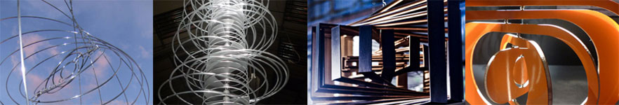 Ivan Black uses the repetition of simple forms to build complex kinetic structures. The introduction of energy, usually by the viewer, creates travelling waves which spiral through the structures, causing shifts in alignment of the component parts. He sets parameters for this movement which, while they restrict the range, allow three clear dimensional forms to emerge at various points of the sculpture’s alignment. Each sculpture is a section of a potentially continuous sequence, confined only by the limitations of the materials.