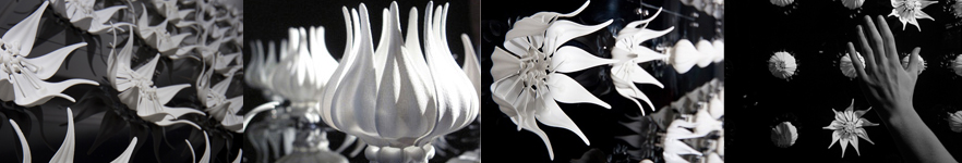 The pieces are laser-sintered prototypes activated by servo-control motors controlled via a PC from a live camera feed. The prototype here shown is purely reactive. It gets “bored” if no one has interacted with it for a while, from 10-60 seconds, and performs a random display to entice people, once engaged each flower moves in response to the viewer. Thus the system does not create a single performance but a space of possible dances for the viewers to explore.