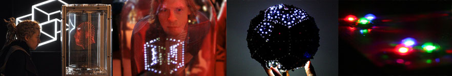 Revolver takes its name from the fundamental principle under which it operates. It uses the phenomenon of persistence of vision to display 3D video by controlling the light emitted from thousands of LEDs in rotation. The light emitted from Revolver appears to be floating in space, creating clouds of overlapping voxels (volumetric pixels) emitting light in every direction. These voxels can be activated at any time to make shapes appear within the 3D volume. 3D animations displayed on Revolver can be seen from any angle. Unlike other 3D display technologies, Revolver creates true volumetric video so that viewers really see in 3D with no need to wear any visual prosthesis for the magic to happen.