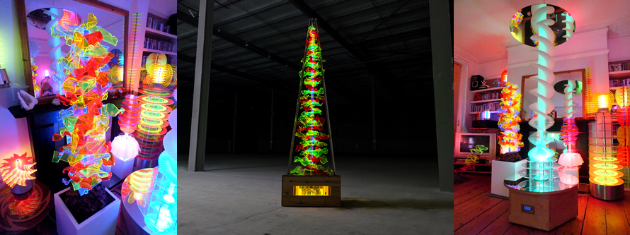 Some of the sculptures are sound responsive, creating interactive, audio-visual installations.